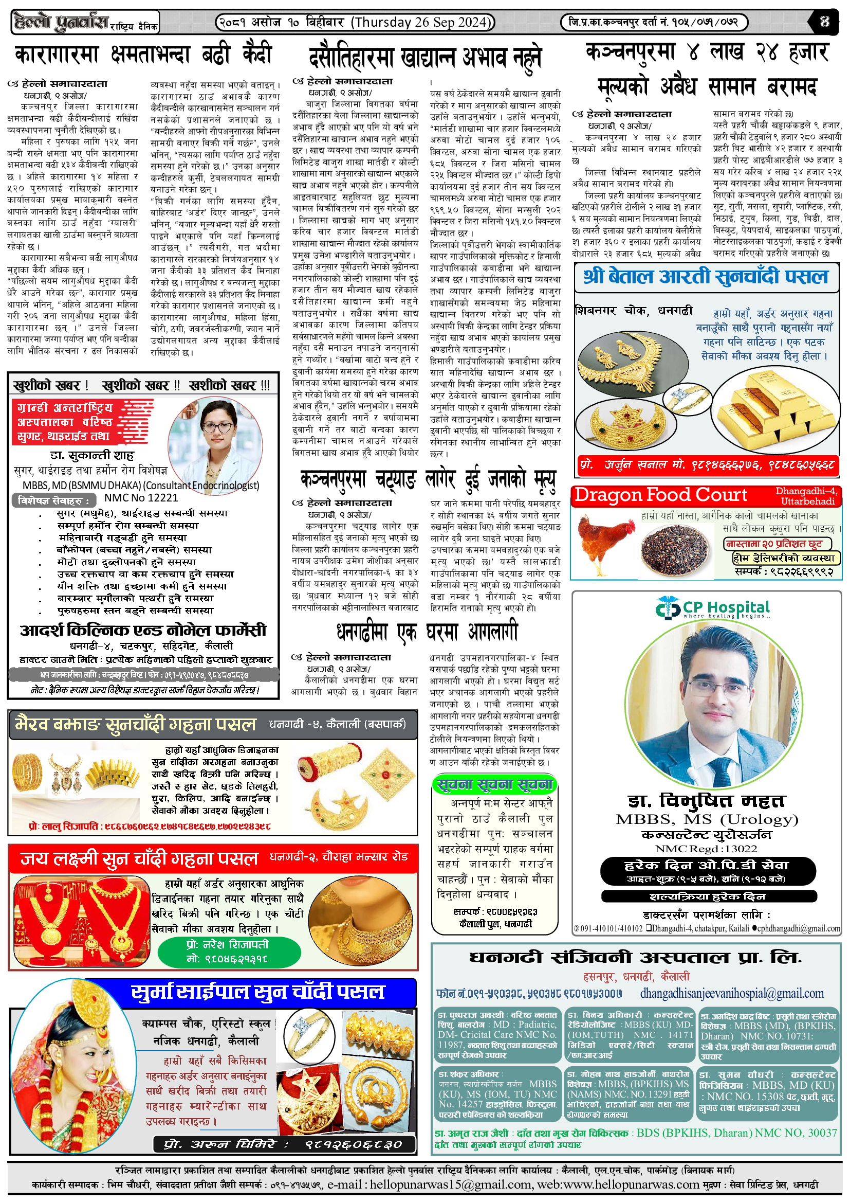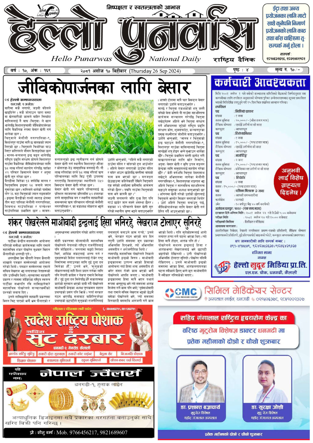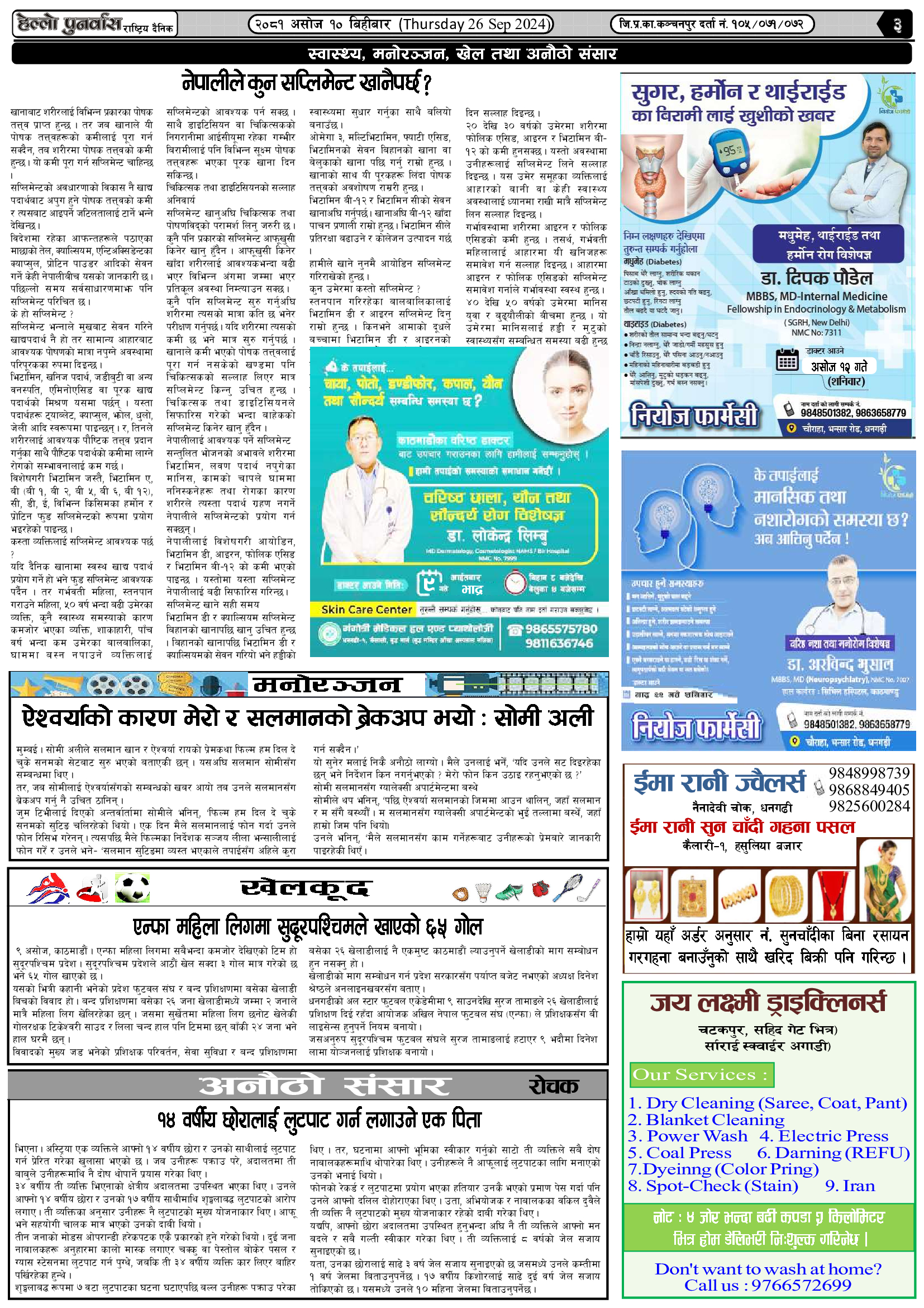 वर्ष : १०, अंक : १६९ २०८१ असोज १० बिहीबार (Thursday 26 Sep 2024) हेल्लो सुदुर शनिबार, १२ आश्विन २०८१, १७:३५ मा प्रकाशित Continue Reading Previous वर्ष : १०, अंक : १६८ २०८१ असोज ९ बुधबार (Wednesday 25 Sep 2024)Next वर्ष : १०, अंक : १७० २०८१ असोज १३ आईतबार (Sunday 29 Sep 2024) सम्बन्धित समाचारहरु जन्मदिनको अवसरमा कुँवरद्वारा २ लाख बढी नगद तथा खाद्यान्न बितरण वर्ष : १०, अंक : २४७ २०८१ माघ २१ सोमबार (Monday 3 Feb. 2025) वर्ष : १०, अंक : २३८ २०८१ माघ ७ सोमबार (Monday 20 Jan. 2025) वर्ष : १०, अंक : २३६ २०८१ माघ ३ बिहीबार (Thursday 16 Jan. 2025) वर्ष : १०, अंक : २३६ २०८१ माघ ३ बिहीबार (Thursday 16 Jan. 2025) वर्ष : १०, अंक : २३५ २०८१ पौष २९ सोमबार (Monday 13 Jan. 2025)