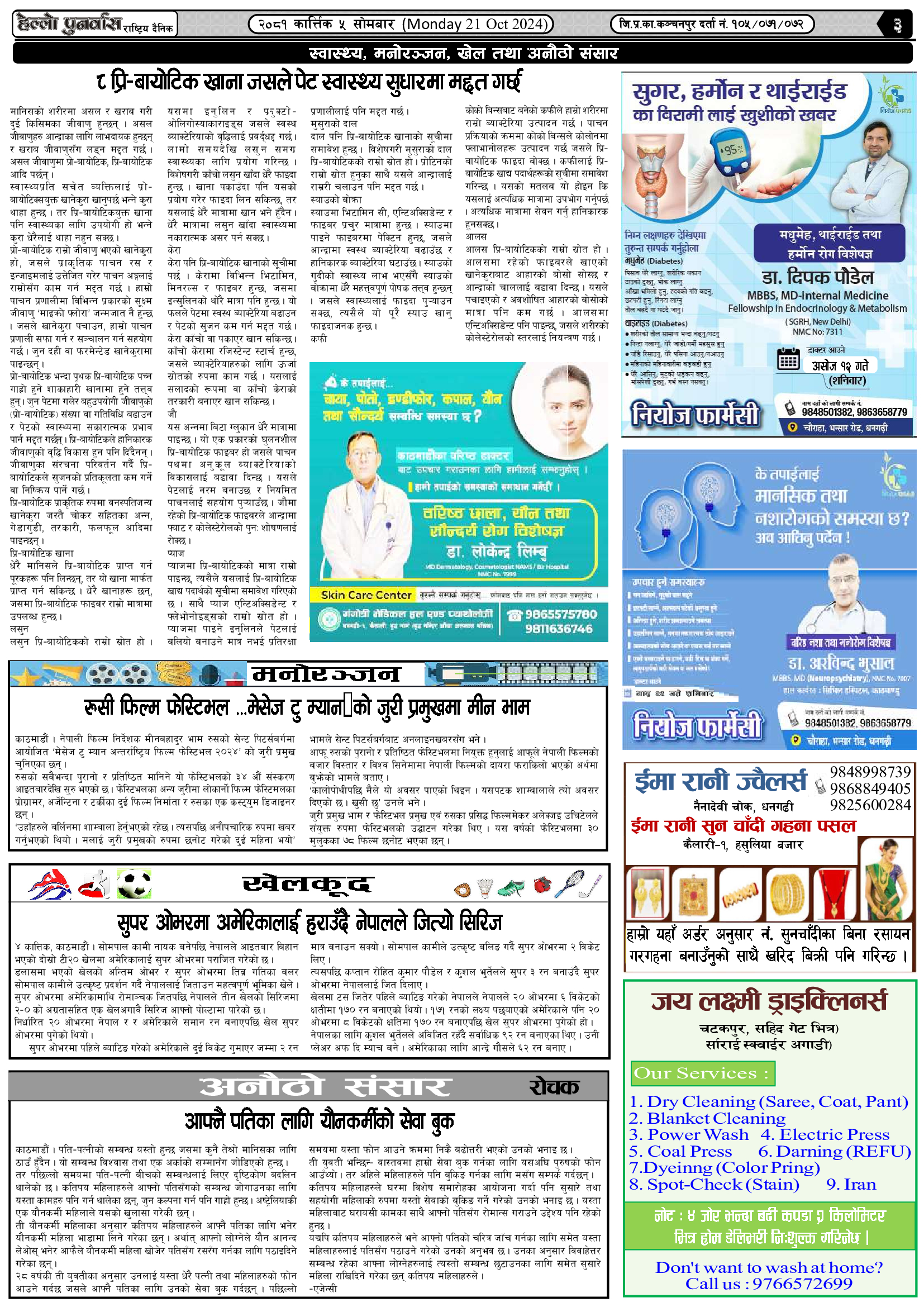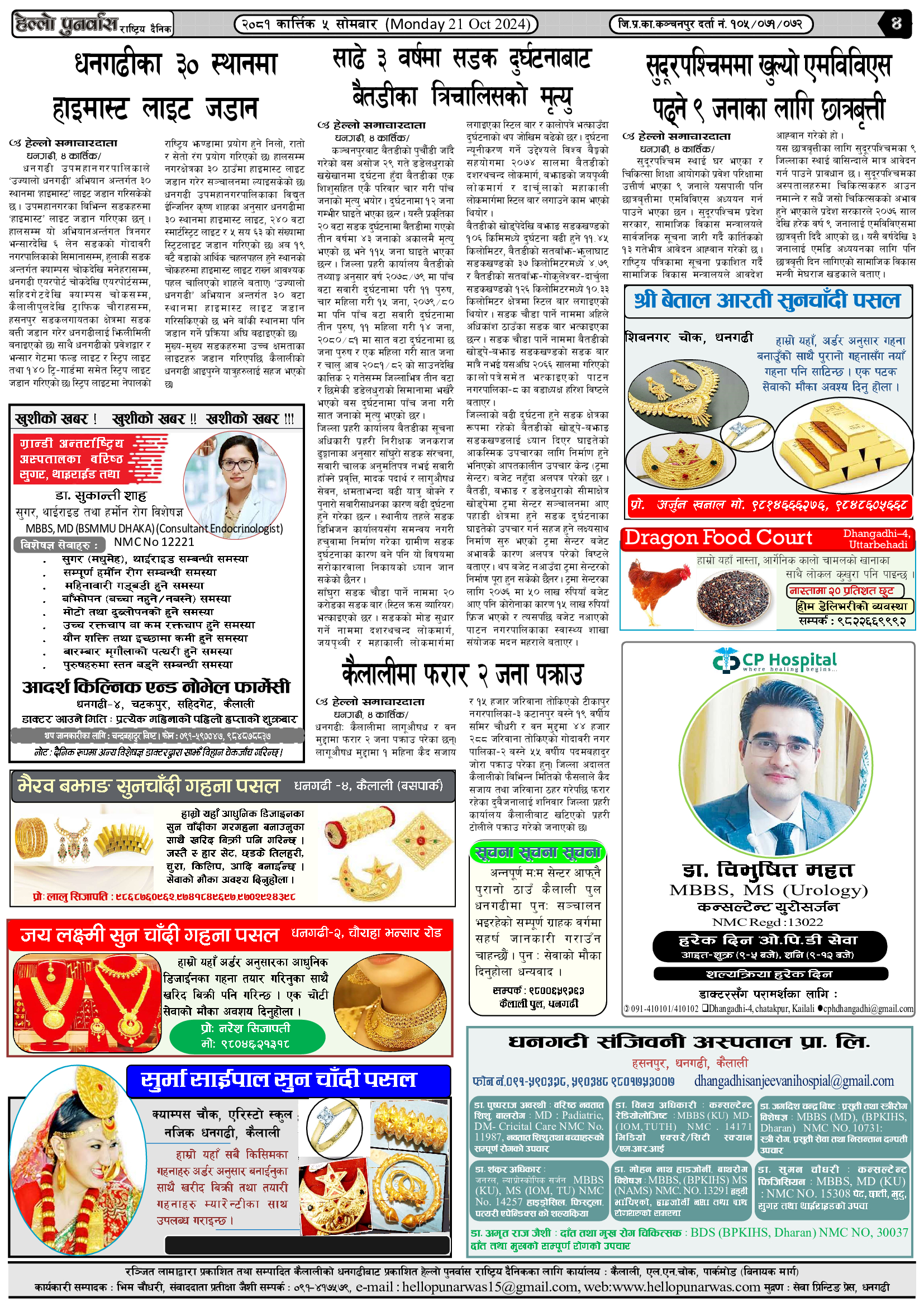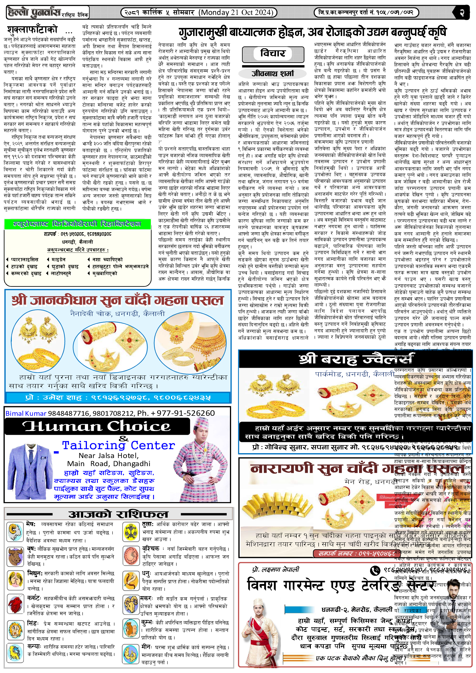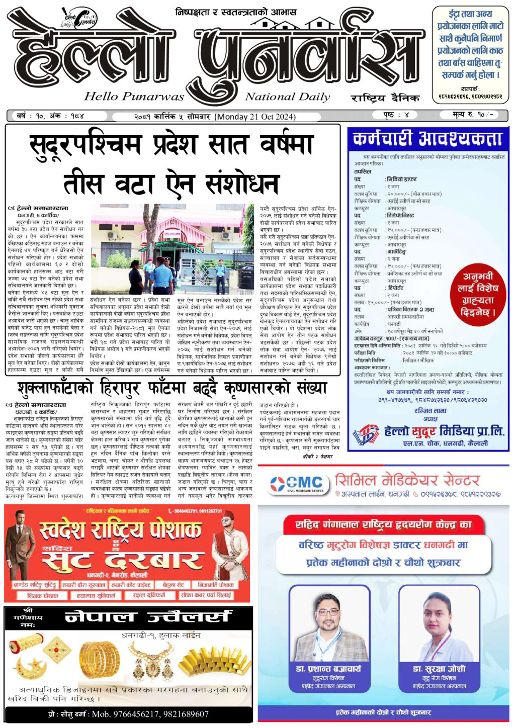 वर्ष : १०, अंक : १८४ २०८१ कात्र्तिक ५ सोमबार (Monday 21 Oct 2024) हेल्लो सुदुर बुधबार, ७ कार्तिक २०८१, १८:०४ मा प्रकाशित Continue Reading Previous वर्ष : १०, अंक : १८३ २०८१ कात्र्तिक ४ आईतबार (Sunday 20 Oct 2024)Next वर्ष : १०, अंक : १८५ २०८१ कात्र्तिक ८ बिहीबार (Thursday 24 Oct 2024) सम्बन्धित समाचारहरु जन्मदिनको अवसरमा कुँवरद्वारा २ लाख बढी नगद तथा खाद्यान्न बितरण वर्ष : १०, अंक : २४७ २०८१ माघ २१ सोमबार (Monday 3 Feb. 2025) वर्ष : १०, अंक : २३८ २०८१ माघ ७ सोमबार (Monday 20 Jan. 2025) वर्ष : १०, अंक : २३६ २०८१ माघ ३ बिहीबार (Thursday 16 Jan. 2025) वर्ष : १०, अंक : २३६ २०८१ माघ ३ बिहीबार (Thursday 16 Jan. 2025) वर्ष : १०, अंक : २३५ २०८१ पौष २९ सोमबार (Monday 13 Jan. 2025)