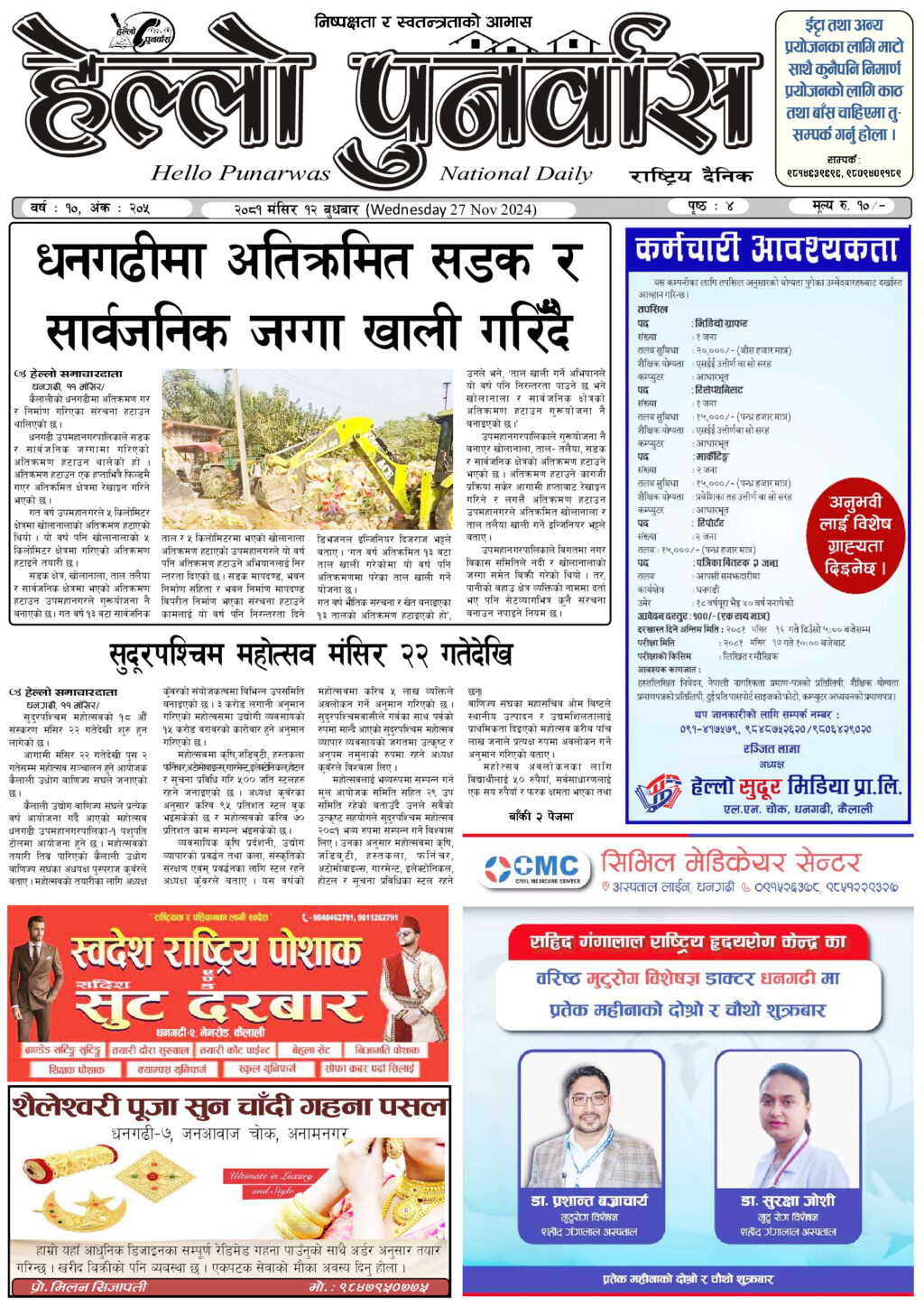 वर्ष : १०, अंक : २०५ २०८१ मंसिर १२ बुधबार (Wednesday 27 Nov 2024) हेल्लो सुदुर बुधबार, १२ मंसिर २०८१, १८:११ मा प्रकाशित Continue Reading Previous वर्ष : १०, अंक : २०४ २०८१ मंसिर १० सोमबार (Monday 25 Nov 2024)Next वर्ष : १०, अंक : २०६ २०८१ मंसिर १३ बिहीबार (Thursday 28 Nov 2024) सम्बन्धित समाचारहरु जन्मदिनको अवसरमा कुँवरद्वारा २ लाख बढी नगद तथा खाद्यान्न बितरण वर्ष : १०, अंक : २४७ २०८१ माघ २१ सोमबार (Monday 3 Feb. 2025) वर्ष : १०, अंक : २३८ २०८१ माघ ७ सोमबार (Monday 20 Jan. 2025) वर्ष : १०, अंक : २३६ २०८१ माघ ३ बिहीबार (Thursday 16 Jan. 2025) वर्ष : १०, अंक : २३६ २०८१ माघ ३ बिहीबार (Thursday 16 Jan. 2025) वर्ष : १०, अंक : २३५ २०८१ पौष २९ सोमबार (Monday 13 Jan. 2025)