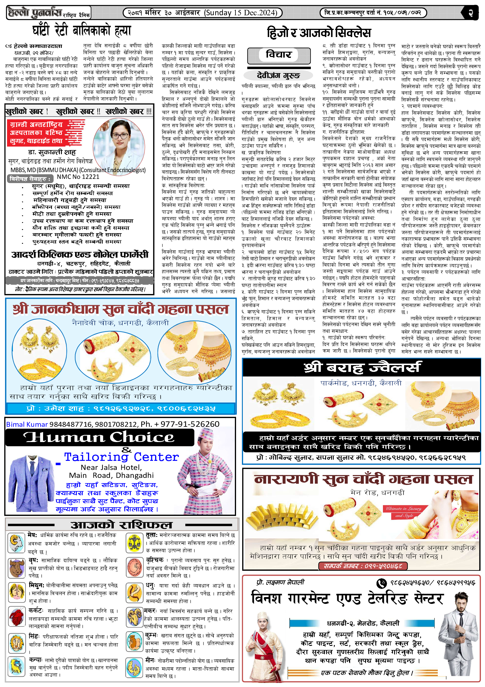 वर्ष : १०, अंक : २२० २०८१ पौष १ सोमबार (Monday 16 Dec. 2024) हेल्लो सुदुर मंगलवार, २ पुष २०८१, १८:०९ मा प्रकाशित Continue Reading Previous वर्ष : १०, अंक : २१९ २०८१ मंसिर ३० आईतबार (Sunday 15 Dec. 2024)Next वर्ष : १०, अंक : २२१ २०८१ पौष ३ बुधबार (Wednesday 18 Dec. 2024) सम्बन्धित समाचारहरु जन्मदिनको अवसरमा कुँवरद्वारा २ लाख बढी नगद तथा खाद्यान्न बितरण वर्ष : १०, अंक : २४७ २०८१ माघ २१ सोमबार (Monday 3 Feb. 2025) वर्ष : १०, अंक : २३८ २०८१ माघ ७ सोमबार (Monday 20 Jan. 2025) वर्ष : १०, अंक : २३६ २०८१ माघ ३ बिहीबार (Thursday 16 Jan. 2025) वर्ष : १०, अंक : २३६ २०८१ माघ ३ बिहीबार (Thursday 16 Jan. 2025) वर्ष : १०, अंक : २३५ २०८१ पौष २९ सोमबार (Monday 13 Jan. 2025)