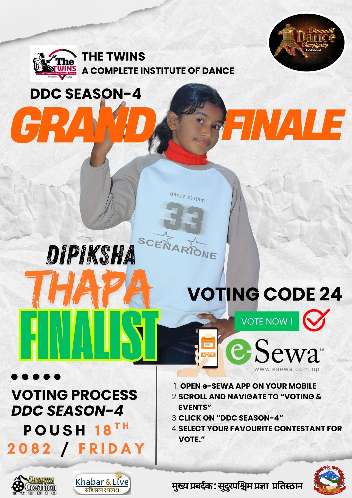 दीपिक्षा र आरोहीलाई इ सेवा एपबाट DDC SEASON_4 दीपिक्षा भोटिङ कोड २४ र आरोही भोटिङ कोड २५ मा यही पौष २५ गतेसम्म भोटिङ गर्न सकिनेछ ।