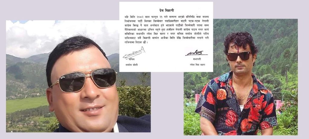 बैतडी, २४ फागुन / बैतडीमा नेपाली कांग्रेस पाटनका नगर सभापति रमेशसिंह महरा र सचिव लवदेव जोशीले पदबाट राजीनामा दिएका छन् । बिहीबार सम्पन्न निर्वाचनमा नेपाली कांग्रेसका उम्मेदवार चतुरबहादुर चन्दको पराजयपछि उनीहरुले नैतिकताका आधारमा राजीनामा दिएको बताएका छन् । पार्टीभित्रैका जिम्मेवार पदाधिकारीबाट निर्वाचनको समयमा पार्टीविरुद्ध पटक–पटक घात–अन्तरघात हुँदै आएकाले आफूहरुले पदमा बसिरहन उचित नभएको जारी विज्ञप्तीमा उल्लेख गरिएको छ । पार्टीकै सदस्यहरु पार्टीका विरुद्ध लागेको पाइएकाले जिम्मेवारीमा बसिरहन उचित नदेखिएकाले आफूहरुले पदबाट राजीनामा गरेको सचिव जोशीले बताए ।
